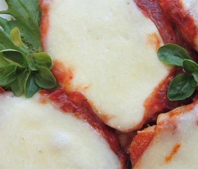 1. Mięso myjemy, osuszamy i nacieramy mieszanką soli, pieprzy i rozmarynu. Smażymy na mocno rozgrzanym oleju do zrumienienia. Odkładamy, lekko studzimy i kroimy wzdłuż na 2-3 plastry.Na tłuszczu pozostałym po smażeniu kurczaka szklimy drobno pokrojoną cebulę. Dodajemy pomidory z puszki (lub ok. 300 ml gęstego przecieru pomidorowego), czosnek przeciśnięty przez praskę, cukier, oregano oraz sól i pieprz do smaku. Zagotowujemy i dusimy przez ok. 5 min. Mięso układamy w naczyniu żaroodpornym, polewamy sosem pomidorowym, przykrywamy i pieczemy przez ok. 35 min w piekarniku rozgrzanym do 1800C. Po tym czasie na mięsie układamy plastry mozzarelli i zapiekamy bez przykrycia przez ok. 10 min, do momentu aż ser się rozpuści.Podajemy jako danie obiadowe z ryżem i sałatą lub z grzankami.
