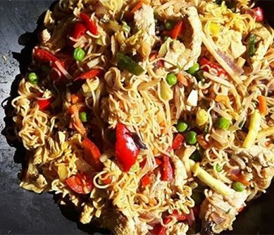 1. Piersi z kurczaka umyć, osuszyć ręcznikiem papierowym i pokroić w cienkie paseczki.Olej rozgrzać w woku i smażyć na nim kurczaka, paprykę i cebulę pokroić w paseczki i dorzucić do woka kiedy kurczak będzie już podsmażonyNastępnie do woka dodać mrożone warzywa i przyprawy, smażyć przez ok 10 min pod przykryciemDodać 500 ml wody i wrzucić makaron, wszystko razem wymieszać, wyłączyć ogień i poczekać aż makaron wchłonie cały płyn. W razie potrzeby dolać wody.