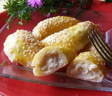1. W naczyniu rozpuścić cukier i drożdże w letniej wodzie.Odstawić w cieple miejsce na ok.10 min pod przykryciem.Do większej miski wsypać mąkę i sól.Gdy drożdże ruszą - zaczną się pienić - wlać je do mąki i ręcznie wyrobić ciasto.Następnie dodać oliwę i jeszcze chwilę wyrabiać aż oliwa się całkowicie wchłonie.Wyrobione ciasto pozostawić w misce, przykryć ściereczką i odstawić do wyrośnięcia na ok. 30 min.. Kalafior podzielić na różyczki, zalać mlekiem i uzupelnić tylko taką ilością wody aby kalafior był zanurzony.Ugotować do miękkości. Następnie przelać przez sito aby pozbyć się płynów a sam kalafior zmiksować z dodatkiem 2 żółtek.Wsypać posiekane pistacje i starty ser. Wymieszać.Doprawić szczyptą gałki muszkatołowej i solą do smaku. Kiedy ciasto przynajmniej podwoi objętość podzielić go na części, każdą część cienko rozwałkować, najlepiej na papierze do pieczenia obsypanym lekko mąką i wycinać szklanką kółka. Na każde nałożyć łyżeczką porcję farszu i palcami oprószonymi mąką formować pierogi dokładnie zlepiając.Rozkłócić pozostałe żółtka i posmarować nimi wierzch pierogów, a następnie posypać sezamem. Piekarnik nagrzać do 180 st. C. Pierogi ułożyć na blasze wyłożonej papierem do pieczenia, wstawić do piekarnika i zapiec 15 - 20 min. na rumiano.Gotowe polać stopionym masłem.