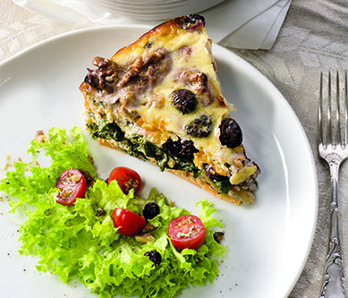 3. Umyj szpinak, sparz go wrzątkiem i odcedź. Winogrona skrój w połówki, cebulę w piórka. Na foremkę z upieczonymi batatami połóż warstwami szpinak, podudzia, winogrona, cebulę i ser Lazur. Dodaj żurawinę i orzechy włoskie na wierzch.