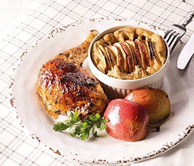 4. Piecz kurczaka przez około 90 minut. Co 20 minut przesmaruj go marynatą. Porcję kurczaka podaj z babeczką i pieczonym jabłkiem. Smacznego!