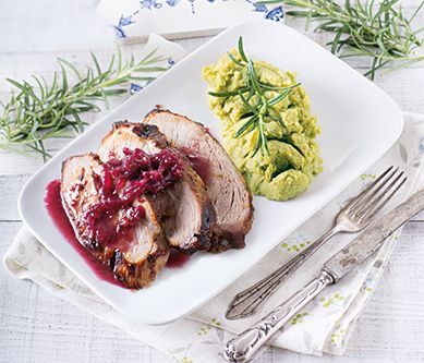 4. Zlej tłuszcz z naczynia żaroodpornego do rondelka wrzuć skrojoną w piórka czerwoną cebulę, duś do miekkości, dodaj dżem, 2 łyżki octu balsamicznego, dopraw solą i pieprzem. Dokładnie wymieszaj do konsystencji sosu.Podawaj cienkie plastry łopatki polane sosem w towarzystwie pureé i czerwonej kapusty. Smacznego!