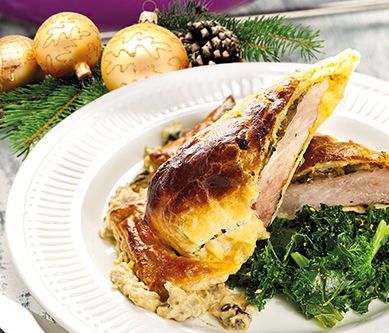 4. Przygotuj zasmażkę - zarumień na patelni mąkę i dodaj do niej 40 g masła. Do pozostałych grzybów dodaj 1 łyżkę musztardy, śmietanę, żurawinę oraz zasmażkę. Do uzyskania odpowiedniej konsystencji sosu użyj wywaru z grzybów. Ugotuj jarmuż w wodzie z solą i cukrem, a następnie przesmaż go na maśle, dodaj wyciśnięty sok z grejpfruta, dopraw solą, pieprzem, oliwą z oliwek i oregano.Na talerz nałóż sos grzybowy, połóż szynkę w cieście oraz jarmuż. Smacznego!