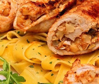 1. Przygotować farsz do roladek: selera obrać i pokroić w kostkę, dusić na maśle, dodać sól, czosnek, miód i sok z granatu oraz pieprz. Delikatnie mieszać od czasu do czasu. Dynię prażyć na suchej patelni, do zrumienienia. Pierś rozbić na cienkie płaty. Posmarować każdego pesto, nałożyć farsz selerowy, posypać pestkami dyni i zwinąć w roladkę, spiąć wykałaczkami. Smażyć z obu stron. Wykałaczki delikatnie wyciągnąć. Podawać z makaronem i rukolą. Smacznego.