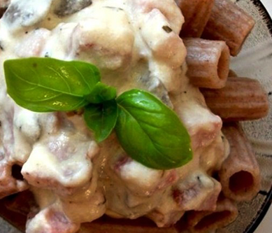 1. Zagotować osoloną lekko wodę na makaron, wrzucić makaron i gotować aż do stanu al dente. ;) Szynkę pokroić w kostkę. Podobnie postąpić z cebulą i serem. Czosnek zetrzeć. Cebulę zeszklić na oliwie, następnie dodać do niej pieczarki ze słoika. Po 2-3 minutach dorzucić szynkę i podsmażać na małym ogniu pod przykryciem 10-15 minut, do miękkości. W tym czasie odcedzić makaron. Śmietanę wymieszać z roztrzepanym jajem i przyprawami, a następnie dodać do smażącej się szynki z cebulką i pieczarkami. Wymieszać dokładnie, zmniejszyć ogień, żeby się nie zwarzyło. Po 2-3 minutach dodać kawałki sera i wymieszać. Mieszać, aż ser się roztopi. Podawać w miseczkach lub na talerzach, udekorowane bazylią.
