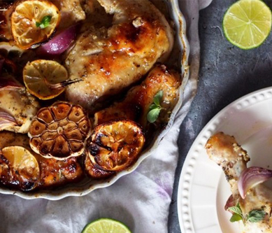 1. Miód, musztardę i olej mieszamy do powstania jednolitego sosu. Dodajemy sok z połowy limonki, zioła, starty imbir i przyprawy. Dokładnie nacieramy ćwiartki i odstawiamy w marynacie na minimum godzinę, idealnie byłoby na całą noc. Układamy w naczyniu, żaroodpornym, przekładamy pociętą cebulą i drugą połową limonki. Przykrywamy folią aluminiową i pieczemy przez ok godzinę w temp 180 stopni i następne 15 minut bez przykrycia ( do zarumienienia skórki)