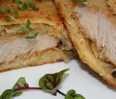 1. 1. Do miseczki włożyć przyprawy i olej. Wymieszać z lekko rozbitym mięsem i odstawić do lodówki na godzinę.2. Kapustę z liściem i zielem angielskim ugotować w niewielkiej ilości wody.3. Mięso oprószyć mąką, kłaść na rozgrzany tłuszcz i smażyć na rumiano z obu stron.4. Podlać mięso bulionem, przykryć i dusić do miękkości.5. Składniki ciasta naleśnikowego zmiksować i usmażyć 4 duże naleśniki. U mnie z tej porcji wyszło 6 dużych naleśników.6. Cebulę pokroić w kostkę. Na patelni rozgrzać łyżkę tłuszczu i usmażyć cebulę z rozmrożonymi grzybami. Mogą być suszone, wcześniej namoczone i ugotowane.7. Do usmażonych grzybów dodać mąkę i mieszając razem przesmażyć.8. Ugotowaną kapustę przełożyć do grzybów. Dodać kostkę grzybową rozpuszczoną w wodzie, doprawić majerankiem, pieprzem i solą.Wymieszać i chwilę razem dusić do połączenia smaków.9. Na środek naleśnika położyć łyżkę kapusty, na wierzch uduszone mięso i znowu kapustę. Złożyć w kopertę.10. Panierować każdy gotowy naleśnik w jajku i bułce tartej. Smażyć na rozgrzanym tłuszczu na złoty kolor z obu stron.