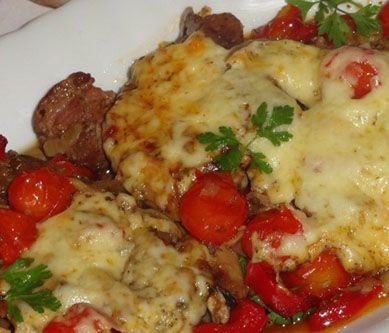 1. Mięso myjemy. Z oleju i przypraw robimy marynatę, nacieramy ją mięso,przekładamy do miski, dodajemy liście laurowe,ziele angielskie i połówki czosnku. Mięso szczelnie zamykamy i wkładamy do lodówki na całą noc.Warzywa oczyszczamy,kroimy.Na patelni rozgrzewamy niewielka ilość oleju, obsmażamy plastry karkówki z obydwu stron. Mięso przekładamy do naczynia żaroodpornego, podlewamy 1/2 szkl. wody lub bulionu, wkładamy do piekarnika nagrzanego do 170 stopni na 40 minut.Na tej patelni co smażyliśmy mięso wrzucamy cebule ,smażymy na rumiano, dodajemy pieczarki oraz paprykę, doprawiamy sola,pieprzem oraz majerankiem, dusimy ok.10 min.Mięso wyciągamy z piekarnika,dodajemy warzywa, wkładamy na ok.20min. Po tym czasie ponownie karczek wyciągamy dodajemy pomidorki i plastry oscypka, zapiekamy do rozpuszczenia sera.Podajemy z ziemniaki i surówką.