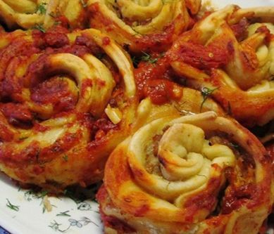 1. Z podanych składników zagniatamy ciasto, jeśli zachodzi taka potrzeba podsypujemy mąką. Ciasto przykrywamy i odkładamy na 15 min, by odpoczęło. Farsz: Cebulkę i czosnek siekamy na drobno, marchew trzemy na tarce- Wszystko podsmażamy na małej ilości oleju i dodajemy do surowego zmielonego mięsa. Doprawiamy i mieszamy. Ciasto wałkujemy, wycinamy 4 koła (szklanką, kubkiem lub foremką). Koła układamy tak, by krawędziami zachodziły na siebie. Dajemy wzdłuż farsz, składamy na pół (jak pierogi) i zwijamy-powstaje róża. Róże układamy w naczyniu żaroodpornym posmarowanym olejem. SOS pomidory zalewamy wrzątkiem, obieramy ze skóry i drobno siekamy. Dodajemy resztę składników i całość gotujemy. Sosem zalewamy róże i całość zapiekamy w temp 18 stopni około 30 minut. Smacznego!