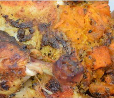 1. Kurczaka myjemy, osuszamy na ręczniku papierowym.Olej mieszamy z pieprzem cytrynowym, oregano oraz solą.Nacieramy marynatą mięso z każdej strony, odstawiamy.Batata obieramy, gotujemy 10 min w osolonym wrzątku, dodajemy dynię.Gotujemy kolejne 5 min.Odcedzone i osuszone warzywa kroimy w kostkę.Kurczaka faszerujemy warzywami, związujemy nóżki.Pieczemy 1 godz. w piekarniku nagrzanym do 180 st.W połowie pieczenia przekręcamy delikatnie mięso na drugą stronę.