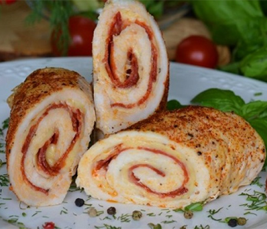 1. Filet z indyka pociąć na 5 dość dużych plastrów, rozbić delikatnie tłuczkiem i oprószyć z obydwu stron solą i pieprzem.Na każdy plaster fileta położyć po 2 plastry sera i 4 plastry kiełbasy chorizo, a następnie zwinąć w roladkę. Każdą roladkę posmarować oliwą, oprószyć przyprawą do kurczaka i ułożyć w naczyniu żaroodpornym wysmarowanym oliwą. Piec w piekarniku nagrzanym do 180 stopni przez około 30-35 minut. Gotowe roladki podawać z młodymi ziemniaczkami i surówką ze świeżych warzyw.