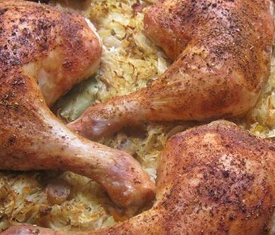 1. Pieczarki pokroić i usmażyć na maśle. Kapustę posiekać i wymieszać z usmażonymi grzybami, z prażoną cebulą, pieprzem, kminkiem, liściem laurowym oraz z zielem angielskim. Kapustę z przyprawami wyłożyć na blaszkę z wyposażenia piekarnika. Do blaszki z kapustą wlać wodę, na kapuście ułożyć ćwiartki kurczaka posypane przyprawą do kurczaka. Całość wstawić do nagrzanego piekarnika, 180 °C na około 60 minut (grzanie górne i dolne). Smacznego!