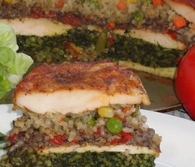 1. Kaszę płuczemy i gotujemy w osolonym wrzątku al dente. Przelewamy zimną woda i dzielimy na dwie części.Filety z kurczaka nacinamy w poprzek ale nie rozcinamy, rozkładamy na płat. Nacieramy przyprawami i odstawiamy na kilka godzin do lodówki.Farsz szpinakowy: Szpinak rozmrażamy. Na patelni rozpuszczamy 2 łyżki masła dodajemy czosnek przeciśnięty przez praskę, podsmażamy, następnie dodajemy szpinak i doprawiamy solą oraz pieprzem, dusimy 5 minut. Dodajemy część kaszy i mieszamy.Farsz pieczarkowo-paprykowy: Pieczarki kroimy w cienkie plasterki, paprykę w paseczki, cebule w piórka. Na patelni roztapiamy 2 łyżki masła, rumienimy cebulę, dodajemy pieczarki, dusimy ok.5 minut, doprawiamy.Farsz warzywny: rozgrzewamy masło, dusimy warzywa ok.8 min, przyprawiamy. Mieszamy z drugą częścią kaszy.Tortownicę śr.18 cm smarujemy masłem, układamy płat fileta, farsz szpinakowy, filet, farsz pieczarkowy, farsz warzywny i filet z kurczaka. Aby kurczak za bardzo się nie spiekł przykrywamy folią aluminiową. Wierzch posypujemy przyprawami i wkładamy tort do piekarnika nagrzanego do 170 stopni na ok.60 minut.