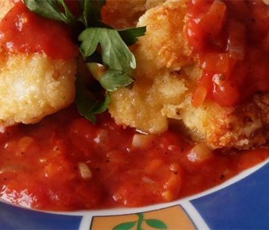 1. Kalafior oczyścić, umyć i podzielić na różyczki. Blanszować w osolonym wrzątku przez ok. 5 min. Ostudzić i osączyć.Cebulę i czosnek pokroić w drobną kostkę i przeszklić na oleju. Dodać przecier i pomidory z puszki wraz z sosem. Gotować sos przez 4-5 min. Doprawić do smaku solą i pieprzem cayenne. Bułkę tartą wymieszać z tartym parmezanem. Różyczki kalafiorowe obtoczyć najpierw w mące, potem w jajku, a następnie w bułce z parmezanem. Smażyć na gorącym maśle lub margarynie z każdej strony na złotobrązowy kolor. Bazylię drobno posiekać,dodać do sosu i zagotować. Kalafior podawać z gorącym sosem z pomidorów.
