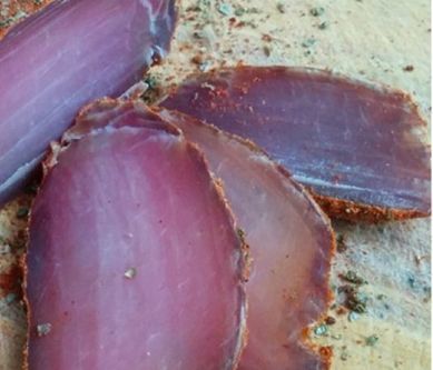 1. Schab myjemy, osuszamy ręcznikiem papierowym. Osuszony schab nacieramy dokładnie solą, przekładamy do miski lub keksówki i odstawiamy na 24 godziny do lodówki.Po 24 godzinach z miski wylewamy wodę, która wyciekła z mięsa, schab płuczemy z nadmiaru soli, osuszamy i obtaczamy dokładnie w cukrze, po czym wkładamy go z powrotem do lodówki na 24 godziny. Ponownie odlewamy nadmiar wody, jeśli jest taka konieczność tzn. jeśli nadal z mięsa wychodzi dużo wody czynności powtarzamy. Jeśli jednak wody w mięsie prawie już nie ma, obtaczamy je w mieszance przygotowanej z suszonej cebuli i pomidorów, papryk i oregano. Tak przyprawione mięso wstawiamy na 12 godzin do lodówki.Po tym czasie mięso przekładamy do podkolanówki, zawiązujemy ją dokładnie i mięso wieszamy w przewiewnym suchym miejscu na okres około 6-14 dni. Po tym okresie mięso będzie gotowe do zajadania. Smacznego!