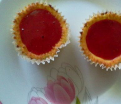 1. Zmielony twaróg zmiksować z jajkami, cukrem oraz cukrem waniliowym.Masę serową wyłożyć do foremek na muffinki. Babeczki piec w temperaturze 160 stopni C. przez około 40 minut. W trakcie pieczenia zrobić mus truskawkowy-zblendować truskawki-po wystygnięciu polać musem truskawkowym po babeczkach. Babeczki nałożyć na talerzyk. Rada: Najlepiej jeść w foremkach, ponieważ po ściągnięciu się rozsypią.