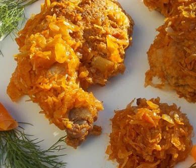 1. 1. Ćwiartki z kurczaka myjemy, osuszamy, posypujemy przyprawą do kurczaka i wstawiamy do lodówki na noc.\n 2. Cebulę obieramy, myjemy, kroimy w drobną kostkę i podsmażamy w garnku z rozgrzanym olejem z dodatkiem soli.\n 3. Marchewkę i selera obieramy, myjemy, ścieramy na tarce na dużych oczkach, dodajemy do cebuli i dusimy.\n 4. Kapustę kiszoną jeśli jest kwaśna płuczemy w zimnej wodzie, drobniej kroimy i dodajemy do warzyw z dodatkiem liści laurowych i ziela angielskiego. Dusimy około 20 minut, w razie potrzeby podlewamy wodą.\n 5. Do kapusty dodajemy sos słodko-kwaśny, koncentrat pomidorowy, cukier, sól, pieprz mieszamy i chwilę dusimy.\n 6. Do wysmarowanego olejem naczynia żaroodpornego wykładamy połowę kapusty, ćwiartki z kurczaka i resztę kapusty. Przykrywamy i pieczemy w rozgrzanym do 200 stopni C piekarniku około godziny.\n\n Smacznego!
