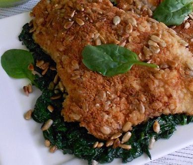 1. Kotlety rozbijamy i doprawiamy. Bułkę tartą łączymy ze słonecznikiem. Kotlety panierujemy w rozmąconym jajku i bułce z ziarnem. Smażymy na rozgrzanym tłuszczu na złoty kolor z obu stron. Szpinak myjemy, osuszamy i wrzucamy na patelnię, smażymy. Dodajemy przeciśnięty czosnek, śmietanę i słonecznik. Podajemy z kotletami. Smacznego!