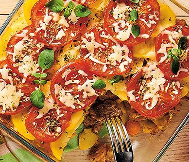 4. Ugotowane ziemniaki pokrój w plasterki i ułóż na dnie naczynia żaroodpornego. Posyp pieprzem cayenne. Na ziemniakach połóż połowę mięsa, posyp odrobiną sera żółtego, następnie połóż warzywa posypane pieprzem cayenne i częścią sera żółtego. Połóż kolejną warstwę: ziemniaki, mięso, ser, warzywa i pieprz cayenne. Całość przykryj ziemniakami, a na wierzchu połóż plastry pomidora. Zalej wszystko sosem z mięsa. Wstaw do piekarnika rozgrzanego do 180°C na około 25 minut. 5 minut przed końcem pieczenia posyp pozostałym serem i słodką papryką. Pozostałe marchewki, selera naciowego oraz obie papryki i korniszony pokrój w duże słupki. Zapiekankę podawaj pokrojoną w dużą kostkę. Warzywa pocięte w słupki włóż do niskiej szklanki, sos tatarski podaj w osobnym naczyniu. Smacznego!