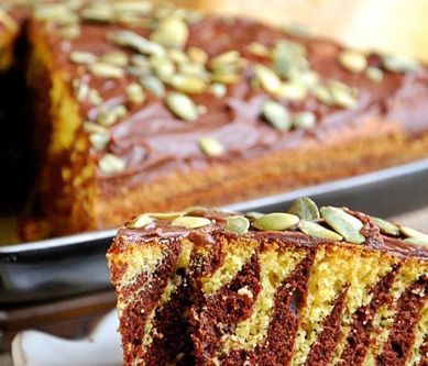 1. 1. Dynię obieramy i pieczemy w piekarniku nagrzanym do 180st C ok 30 minut. Miękką miksujemy na gładkie puree. Studzimy. Białka oddzielamy od żółtek i ubijamy ze szczyptą soli na sztywną pianę. Stopniowo dodajemy po odrobinie cukru i jednym żółtku. Gotową masę jajeczną łączymy z musem dyniowym- możemy miksować na najwolniejszych obrotach. Kolejnym krokiem jest dodanie przesianej mąki z proszkiem do pieczenia, cukru waniliowego, a na końcu oleju. 2. Ciasto dzielimy na dwie części, do jednej dodajemy dwie łyżki kakao i mieszamy. Jeśli jest zbyt gęste, możemy dodać jeszcze 3 łyżki mleka. (Ja nie dodawałam.) Ciasto wylewamy po jednej łyżce naprzemiennie z jasnym ciastem na wysmarowaną tłuszczem i wysypaną bułką tartą blaszkę. Przed pieczeniem możemy nasze ciasto przeciągnąć jeszcze wykałaczką od środka do boków tworząc pajęczynę. Pieczemy w temp. 180st C. przez ok 50 minut. Po upływie 30 minut ciasto możemy przykryć folią aluminiową by zbytnio się nie spiekło z wierzchu. Jeszcze ciepłe polewamy roztopioną z mlekiem czekoladą i posypujemy pestkami dyni.