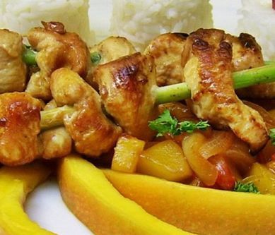 1. Szaszłyki Pierś z kurczaka myjemy, kroimy w kostkę. Mieszamy sos sojowy, sok z cytryny i miód. Kawałki kurczaka oprószamy solą i pieprzem i zanurzamy w marynacie. Odstawiamy na pół godziny do lodówki. Trawę cytrynową myjemy osuszamy, dzielimy na pół lub ćwiartki. Nabijamy kawałki kurczaka i smażymy na rozgrzanym oleju na złoto z każdej strony. Sos mango Cebulki obieramy, kroimy w piórka. Wyciskamy sok z limonki. Na patelni karmelizujemy cukier, zalewamy sokiem z limonki i winem. Dodajemy cebulkę i dusimy ok 5 min. Mango obieramy (można zostawić kawałki do dekoracji), kroimy w kostkę. Papryczki myjemy, kroimy w kostkę. Dodajemy mango i papryki do cebuli, mieszamy. Siekamy natkę pietruszki, posypujemy, doprawiamy solą i pieprzem. Ryż gotujemy według przepisu na opakowaniu. Robimy ozdobne kopczyki. Dekorujemy papryką i natką. Nakładamy porcje sosu mango, na to układamy szaszłyki. Smacznego!