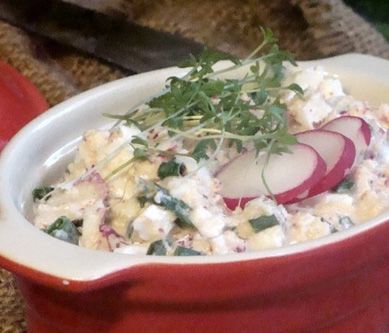 1. Rzodkiewkę umyć i odciąć liście, następnie zetrzeć na drobnych oczkach tarki, jajka pokroić w kostkę i dodać do startej rzodkiewki, dołożyć posiekany szczypior oraz majonez. Do przygotowanych składników dodać sól, pieprz i delikatnie, ale dokładnie wszystko wymieszać. Sałatkę podawać z dodatkiem pieczywa.