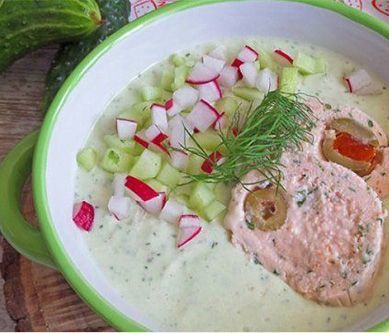 1. Łososia zmiksować z białym serkiem i chrzanem, dodać bazylię i koperek, wymieszać. Masę łososiową wyłożyć na foli spożywczej, w środku poukładać oliwki, a następnie zwinąć w roladę. Na końcach folię związać i schłodzić. Schłodzoną terrine pokroić w plastry.Awokado obrać i usunąć pestkę. Ogórki obrać i razem z rzodkiewkami posiekać na drobną kostkę. Kefir zmiksować za pomocą blendera z jogurtem, awokado, dwoma ogórkami, koperkiem i sokiem z cytryny. Doprawić solą i pieprzem, schłodzić. Schłodzony chłodnik podawać z terriną z wędzonego łososia, pokrojonym w kostkę ogórkiem oraz rzodkiewką.