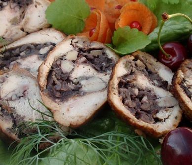 1. Przygotowanie farszu:Ugotowanego buraka ścieramy na tarce. Jabłko i cebulę kroimy w kostkę, a następnie drobno siekamy orzechy. Dodajemy 2 łyżki oleju i 2 łyżki konfitury z tarniny. Doprawiamy pieprzem i dokładnie mieszamy. Przygotowanie mięsa:Filet z kurczaka rozcinamy na 4 płaty.Rozbijamy i odrobinę doprawiamy do smaku solą i pieprzem.Na każdy płat mięsa kładziemy plaster szynki np. szwarcwaldzkiej.Następnie wykładamy farsz i ciasno zwijamy roladki.Obtaczamy je w jajku oraz bułce tartej i smażymy ze wszystkich stron aż do uzyskania złotego koloru.Tak przygotowane roladki drobiowe można zaserwować na ciepło na obiad lub podać, pokrojone w plastry, na kolację.
