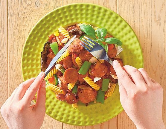 4. Ugotuj mieszankę warzyw i połącz ją z resztą składników. Wyłóż gotowe danie na talerz i posyp serem kanapkowo-sałatkowym typu feta. Smacznego!