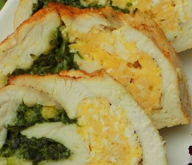 1. Filety pokroić na plastry, lekko rozbić tak aby nie zrobić dziur. Mięso ułożyć na folii spożywczej lub aluminiowej na kształt prostokąta, zakładając kawałki jeden za drugi. Natrzeć przyprawami. Szpinak usmażyć na łyżce masła, doprawić czosnkiem, solą i pieprzem, a na końcu dokładnie wymieszać z serkiem topionym. Jajka roztrzepać i usmażyć na maśle jajecznicę. Na mięsie rozsmarować szpinak a obok jajecznicę. Całość zwinąć w roladę, jeśli trzeba to obwiązać bawełnianą nitką. Blaszkę do pieczenia mięsa posmarować olejem i ułożyć roladę. Piec około 40 minut w 200*C. Po upieczeniu odczekać kilka minut przed krojeniem. Smacznego!