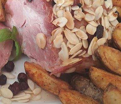 1. Przygotowujemy roztwór z soli peklującej, którym peklujemy karkówkę. Do pozostałej zalewy dodajemy liść laurowy, ziele angielskie i pieprz ziarnisty. Po zapeklowaniu karkówki wkładamy ją do zalewy przykrywamy i odstawiamy w chłodne miejsce na ok. 24 godziny. Następnego dnia mięso wyjmujemy z zalewy i faszerujemy żurawiną oraz pokrojonym na zapałkę czosnkiem.Tak przygotowaną umieszczamy w naczyniu żaroodpornym pod przykryciem na ok. 1,5 godziny w temperaturze 180 stopni. Po upływie wyznaczonego czasu wierzch karkówki smarujemy mieszanką koncentratu pomidorowego z miodem i posypujemy obficie migdałami. Następnie wstawiamy do piekarnika na 15 minut.Do karkówki proponuję smażone ziemniaki krojone w półksiężyce. Smacznego!