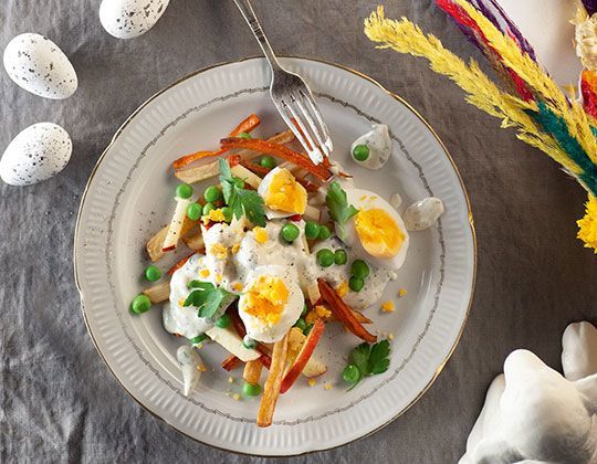 1. Marchew i ziemniaki pokroić w słupki i usmażyć na patelni. Majonez wymieszać z siekanymi kaparami, groszkiem. Na talerzu ułożyć marchew z ziemniakami i jabłkiem. Następnie dodać sos. Sałatkę doprawić solą i pieprzem.