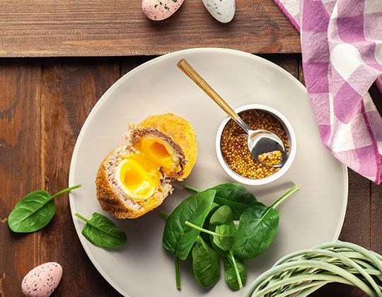 1. Cebulę poddusić z czosnkiem, przestudzić i dodać do mielonego mięsa. Następnie dodać musztardę dijon, sól i pieprz. Wymieszać wszystkie składniki. Ugotowane na miękko jajka zawinąć w mięso. Następnie obtoczyć w mące, jajku, a potem w bułce. Smażyć w głębokim tłuszczu przez 6 minut. Podawać z musztardą francuską.