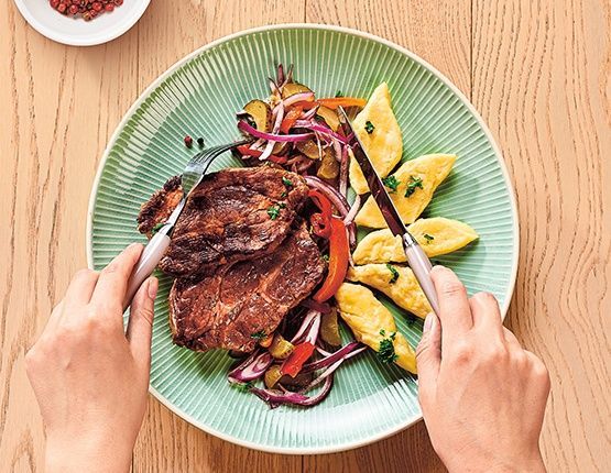 1. Na patelni rozgrzej smalec i obsmaż na nim pokrojoną w plastry o grubości 1,5 cm karkówkę tak, aby były dobrze zarumienione z każdej strony. Pod koniec smażenia posól. Przełóż do naczynia żaroodpornego.