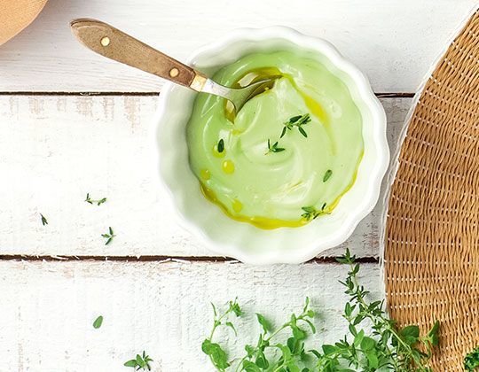 1. Olej dokładnie zmiksować z natką i szczypiorkiem. Następnie przecedzić. Zielony olej połączyć z majonezem. Uzyskany sos nałożyć do miseczki i posypać tymiankiem.