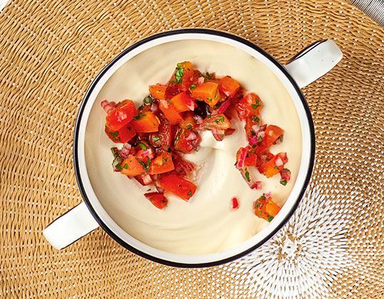 1. Pomidora pokroić w drobną kostkę. Tak samo postąpić z cebulą. W misce wymieszać pomidory z cebulą i siekaną natką. Delikatnie posolić i dodać ocet. Odstawić na 30 minut. Majonez nałożyć do miseczek, a na wierzch dodać salsę bez zalewy.