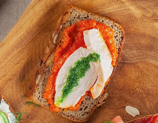 1. Kurczaka posolić i doprawić pieprzem. Następnie usmażyć na patelni lub zgrillować. Pokroić na plasterki. Pieczywo posmarować ajwarem i nałożyć kurczaka.