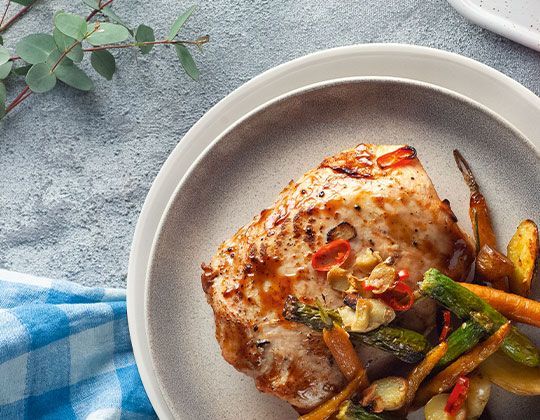 1. Pierś posolić i doprawić pieprzem. Natrzeć sosem chili i skropić sosem sojowym. Warzywa umyć. Wszystkie składniki włożyć do brytfanki i skropić tłuszczem. Piec w 180 stopniach przez 35 minut. Podawać z sosem chili.