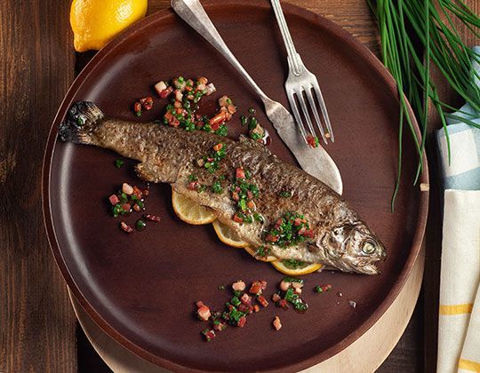 1. Pstrąga posolić i doprawić pieprzem. Nadziać plasterkami cytryny i piec w 200 stopniach przez 20 minut. W tym czasie na patelni usmażyć boczek pokrojony w kostkę. Gdy się przyrumieni, zdjąć z ognia i dodać posiekany szczypiorek. Upieczoną rybę polać przed podaniem boczkiem ze szczypiorkiem.