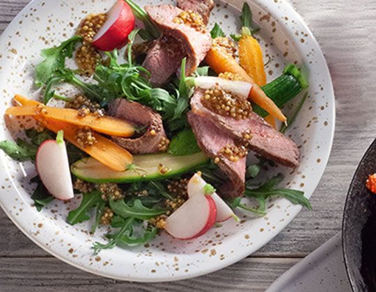 1. Stek delikatnie skropić tłuszczem i smażyć, aż się zarumieni. Dopiero potem należy go posolić i popieprzyć. Następnie pokroić w cienkie plasterki. W miseczce połączyć musztardę z sokiem z cytryny i miodem. Na talerzu ułożyć rukolę, ugotowane i pokrojone nowalijki oraz rzodkiewkę. Na nich plasterki wołowiny. Wszystko polać przygotowanym wcześniej sosem.