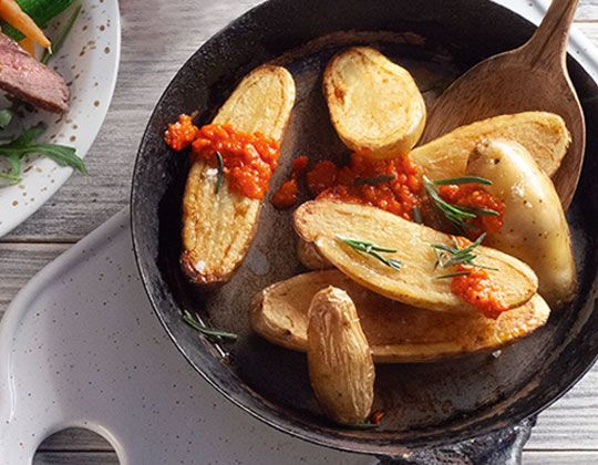 1. Bakłażana, papryki i pomidory dokładnie zmiksować. Następnie przełożyć na patelnię, dolać połowę oleju i smażyć, aż masa odparuje i zgęstnieje. Doprawić do smaku solą, octem i cukrem. Ziemniaki skropić pozostałym tłuszczem, piec w piekarniku rozgrzanym do 200 stopni, aż zmiękną i przyrumienią się. Podawać z wystudzonym ajwarem i rozmarynem.