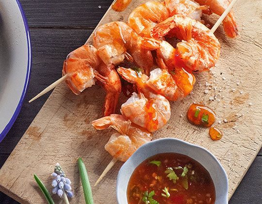 1. Krewetki nabić na patyczki. Doprawić solą i pieprzem. Skropić olejem i grillować przez 3 minuty. W tym czasie połączyć pozostałe składniki i dokładnie wymieszać. Krewetki podawać polane sosem.
