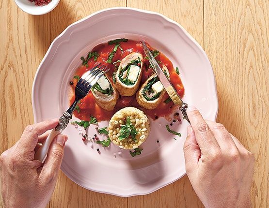 3. Na rozbite kotlety nałóż przygotowany farsz oraz kawałki sera feta. Zwiń mocno roladki i obsmażaj z każdej strony. Następnie przełóż je do garnka, zalej wodą i odczekaj do jej zagotowania. Dodaj pomidory z puszki, resztę posiekanej bazylii oraz sól i pieprz do smaku.