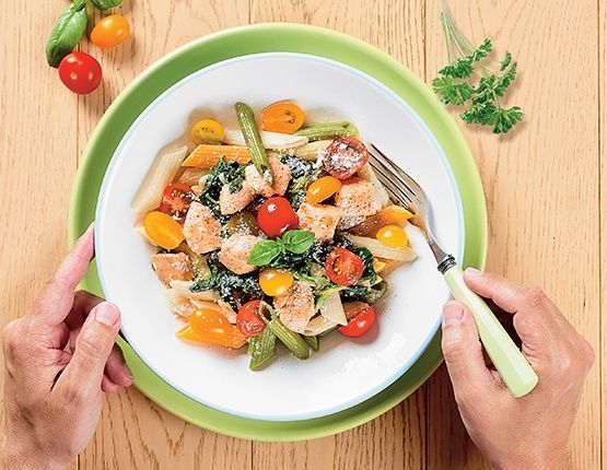 4. Do szpinaku dodaj śmietanę i kurczaka. Gotuj sos przez kilka minut. Dopraw do smaku solą oraz pieprzem. Makaron z kurczakiem i sosem podawaj w głębokim talerzu. Posyp startym parmezanem. Smacznego!