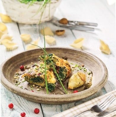 1. Na patelni na małym ogniu rozmroź szpinak. Odcedź go. Na tłuszczu zeszklij cebulę i czosnek, dodaj szpinak i dopraw do smaku gałką muszkatołową, solą i pieprzem. Dodaj żurawinę i orzechy.