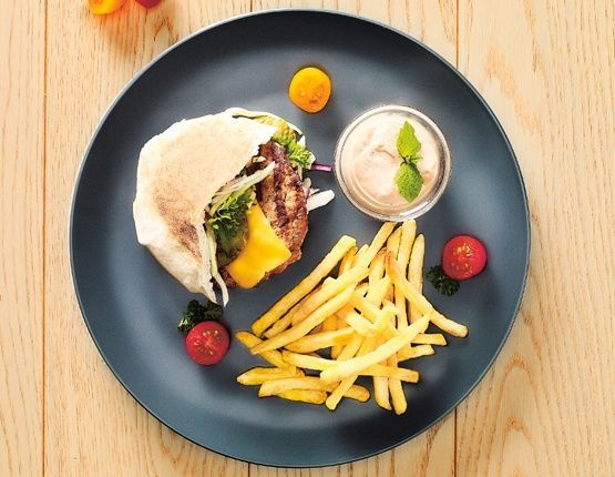 2. Po wyjęciu z lodówki uformuj z mięsa płaskie kotlety, tak aby zmieściły się w chlebku pita (muszą być mniejsze od chlebka). Smaż na patelni grillowej po kilka minut z każdej strony lub piecz w piekarniku rozgrzanym do 180°C przez ok. 30 min. Chwilę przed wyjęciem kotletów na każdym z nich połóż plasterek sera.
