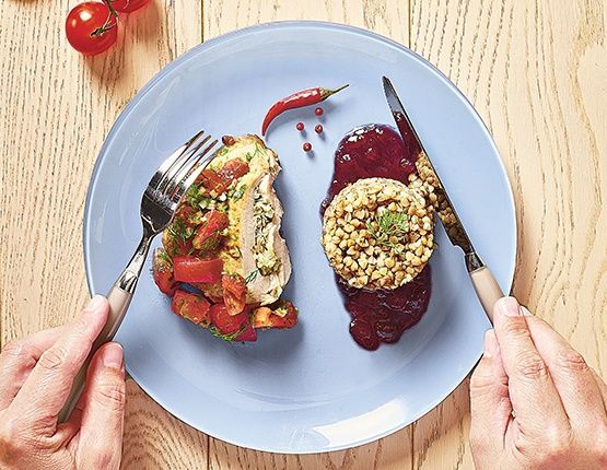 4. Rukolę umyj i włóż do wysokiego naczynia. Dodaj pozostałą oliwę, sól, pieprz i ząbek czosnku. Zmiksuj na gładki sos. Pomidory sparz, obierz ze skórki i pokrój w kostkę. Szalotkę pokrój. Z cytryny zetrzyj skórkę i wyciśnij sok. Wszystko dodaj do sosu z rukoli i delikatnie wymieszaj. Dopraw solą i pieprzem. Kaszę ugotuj według przepisu na opakowaniu, a potem przesmaż na łyżce roztopionego masła. Kieszonki podawaj polane salsą z rukoli, a kaszę posypaną posiekanym koperkiem na kleksie z konfitury żurawinowej. Smacznego!