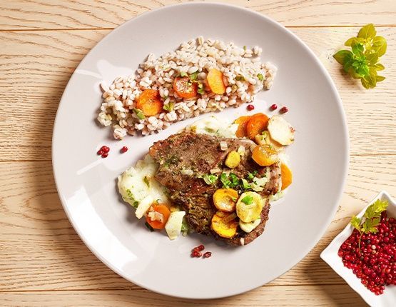 3. Karkówkę obsmaż z obu stron na pozostałym rozgrzanym oleju. Zalej bulionem i duś ok. 40 minut. Dodaj warzywa z patelni i duś jeszcze ok. 20 minut.